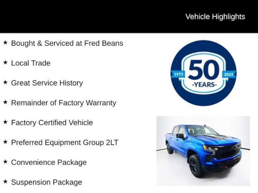 CARFAX One-Owner.2022 Chevrolet Silverado 1500 LT Trail Boss EcoTec3 5.3L V8 10-Speed Automatic 4WD 4D Crew Cab Glacier Blue Metallic Bought & Serviced at Fred Beans, Local Trade, Great Service History, Remainder of Factory Warranty, Factory Certified Vehicle, 10-Speed Automatic, 4WD, Black Cloth, 10-Way Power Driver Seat w/Lumbar, 12.3 Multicolor Reconfigurable Digital Display, 120-Volt Instrument Panel Power Outlet, 6-Speaker Audio System, All-Weather Floor Liner (LPO) (AAK), Auto-Locking Rear Differential, Bluetooth® For Phone, Color-Keyed Carpeting Floor Covering, Compass, Convenience Package, Deep-Tinted Glass, Dual Rear USB Ports (Charge Only), Dual-Zone Automatic Climate Control, Electric Rear-Window Defogger, Electrical Steering Column Lock, Electronic Cruise Control, EZ Lift Power Lock & Release Tailgate, Front LED Fog Lamps, HD Rear Vision Camera, Heated Driver & Front Outboard Passenger Seats, Heated Power-Adjustable Outside Mirrors, Heated Steering Wheel, Heavy-Duty Air Filter, High Gloss Black Mirror Caps, Hill Descent Control, Inside Rear-View Mirror w/Tilt, Keyless Open & Start, Leather Wrapped Steering Wheel, LED Cargo Area Lighting, Manual Tilt/Telescoping Steering Column, OnStar & Chevrolet Connected Services Capable, Performance Red Recovery Hooks, Power Front Windows w/Driver Express Up/Down, Power Front Windows w/Passenger Express Down, Power Rear Windows w/Express Down, Preferred Equipment Group 2LT, Rear 60/40 Folding Bench Seat (Folds Up), Remote Vehicle Starter System, SiriusXM w/360L, Standard Tailgate, Steering Wheel Audio Controls, Suspension Package, Theft Deterrent System (Unauthorized Entry), Trailering Package, Wireless Phone Projection.Odometer is 16088 miles below market average!Certified. Chevrolet Certified Pre-Owned Details:* Limited Warranty: 12 Month/12,000 Mile (whichever comes first) from certified purchase date* 24 months/24,000 miles (whichever comes first) Certified Pre-Owned Scheduled Maintenance Plan and 3 days/150 miles (whichever comes first) Vehicle Exchange Program. SiriusXM 3-month trial subscription.* Powertrain Limited Warranty: 72 Month/100,000 Mile (whichever comes first) from original in-service date* Transferable Warranty* 172 Point Inspection* Vehicle History* Roadside Assistance* Warranty Deductible: $0For better peace of mind all our used vehicles have a 127-point inspection and come with a 5-day return, 30-day exchange (As-Is vehicles are excluded). Our exclusive Auto Rewards Program provides better value with Free First Oil change, Free Pa State Safety inspections, discounts for local merchants and more. Plus, you can earn up to $2000 towards your next vehicle just by servicing with Fred Beans! As Fred Beans always says, our used cars are better because our reputation depends on it.Although every reasonable effort has been made to ensure the accuracy of the information contained on this site, absolute accuracy cannot be guaranteed. This site, and all information and materials appearing on it, are presented to the user as is without warranty of any kind, either express or implied. All vehicles are subject to prior sale. Price does not include applicable tax, title, license, processing and/or documentation fees. Vehicles shown at different locations are not currently in our inventory (Not in Stock) but can be made available to you at our location within a reasonable date from the time of your request, not to exceed one week. Residency restrictions may apply.