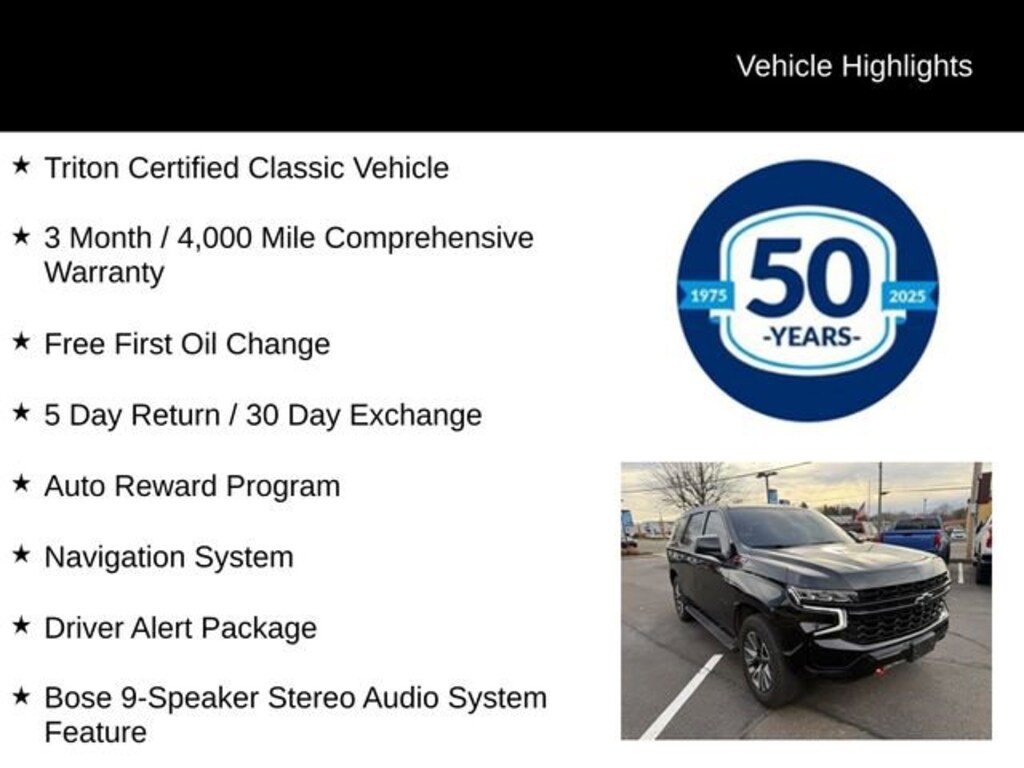 Clean CARFAX. CARFAX One-Owner.Recent Arrival! 2023 Chevrolet Tahoe Z71 EcoTec3 5.3L V8 10-Speed Automatic with Overdrive 4WD 4D Sport Utility Black Triton Certified Classic Vehicle, 3 Month / 4,000 Mile Comprehensive Warranty, Free First Oil Change, 5 Day Return / 30 Day Exchange, Auto Reward Program, 4WD, Black Leather, 2nd Row Pwr Release 60/40 Split-Folding Bench Seat, 3rd Row 60/40 Power-Folding Split-Bench Seat, Bose 9-Speaker Stereo Audio System Feature, Driver Alert Package, HD Surround Vision, Heated 2nd Row Outboard Seats, Heated Steering Wheel, Memory Settings, Navigation System, Outside Heated Power-Adjustable Mirrors, Power Tilt & Telescopic Steering Column, Rear Pedestrian Alert.Odometer is 6141 miles below market average!Certified. Chevrolet Certified Pre-Owned Details:* 24 months/24,000 miles (whichever comes first) Certified Pre-Owned Scheduled Maintenance Plan and 3 days/150 miles (whichever comes first) Vehicle Exchange Program. SiriusXM 3-month trial subscription.* Warranty Deductible: $0* Powertrain Limited Warranty: 72 Month/100,000 Mile (whichever comes first) from original in-service date* Limited Warranty: 12 Month/12,000 Mile (whichever comes first) from certified purchase date* Vehicle History* Roadside Assistance* Transferable Warranty* 172 Point InspectionFor better peace of mind all our used vehicles have a 127-point inspection and come with a 5-day return, 30-day exchange (As-Is vehicles are excluded). Our exclusive Auto Rewards Program provides better value with Free First Oil change, Free Pa State Safety inspections, discounts for local merchants and more. Plus, you can earn up to $2000 towards your next vehicle just by servicing with Fred Beans! As Fred Beans always says, our used cars are better because our reputation depends on it.Although every reasonable effort has been made to ensure the accuracy of the information contained on this site, absolute accuracy cannot be guaranteed. This site, and all information and materials appearing on it, are presented to the user as is without warranty of any kind, either express or implied. All vehicles are subject to prior sale. Price does not include applicable tax, title, license, processing and/or documentation fees. Vehicles shown at different locations are not currently in our inventory (Not in Stock) but can be made available to you at our location within a reasonable date from the time of your request, not to exceed one week. Residency restrictions may apply.