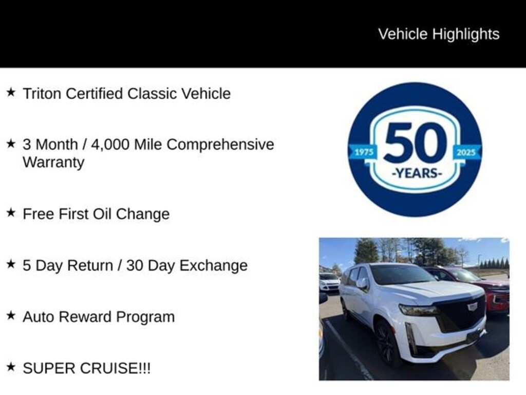 Recent Arrival! 2021 Cadillac Escalade ESV Sport 6.2L V8 10-Speed Automatic with Overdrive 4WD 4D Sport Utility Crystal White Tricoat Triton Certified Classic Vehicle, 3 Month / 4,000 Mile Comprehensive Warranty, Free First Oil Change, 5 Day Return / 30 Day Exchange, Auto Reward Program, SUPER CRUISE!!!, 4WD.Certified. Certification Program Details: Triton Certified Shield Classic 3-Month or 4,000-Mile Comprehensive Coverage ($100 deductible) 100+ Multipoint Inspection PA State Inspection & Emissions Test Oil, Lube, & Filter Service Completed 5-Day Return Policy1 30-Day Exchange Policy2 CARFAXTM Report AutoRewards Membership See salesperson for additional offers & complete details.For better peace of mind all our used vehicles have a 127-point inspection and come with a 5-day return, 30-day exchange (As-Is vehicles are excluded). Our exclusive Auto Rewards Program provides better value with Free First Oil change, Free Pa State Safety inspections, discounts for local merchants and more. Plus, you can earn up to $2000 towards your next vehicle just by servicing with Fred Beans! As Fred Beans always says, our used cars are better because our reputation depends on it.Although every reasonable effort has been made to ensure the accuracy of the information contained on this site, absolute accuracy cannot be guaranteed. This site, and all information and materials appearing on it, are presented to the user as is without warranty of any kind, either express or implied. All vehicles are subject to prior sale. Price does not include applicable tax, title, license, processing and/or documentation fees. Vehicles shown at different locations are not currently in our inventory (Not in Stock) but can be made available to you at our location within a reasonable date from the time of your request, not to exceed one week. Residency restrictions may apply.