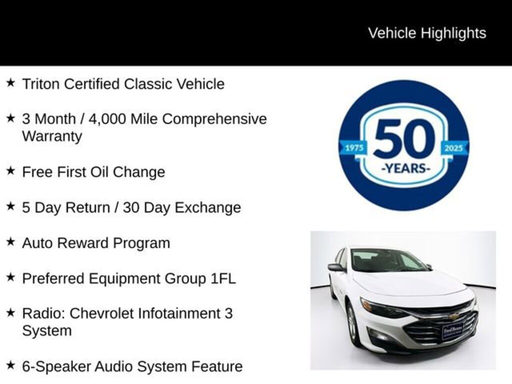 Discover the perfect blend of style, comfort, and performance with this 2021 Chevrolet Malibu LS 1FL. This sleek and modern sedan offers a remarkable driving experience, packed with a host of premium features that elevate your daily commute. Triton Certified Classic Vehicle 3 Month / 4,000 Mile Comprehensive Warranty Free First Oil Change 5 Day Return / 30 Day Exchange Auto Reward Program License Plate Bracket, Front Preferred Equipment Group 1FL 6-Speaker Audio System Feature Premium audio system: Chevrolet Infotainment 3 Radio: Chevrolet Infotainment 3 System Exterior Parking Camera Rear Wireless Apple CarPlay/Android AutoUnder the hood, this Malibu boasts a 1.5L DOHC engine, delivering an impressive 29 MPG in the city and 36 MPG on the highway. The CVT transmission and front-wheel-drive configuration provide a smooth, responsive ride, making this sedan a joy to drive in any conditions.Step inside and you'll be greeted by a well-appointed interior, featuring premium cloth seating, a 6-way manual driver's seat, and a 6-way manual front passenger seat. The Chevrolet Infotainment 3 system, with its intuitive touchscreen interface, keeps you connected and entertained, while the 6-speaker audio system provides a rich, immersive listening experience.This 2021 Chevrolet Malibu LS 1FL is a Triton Certified Classic Vehicle, meaning it has been thoroughly inspected and reconditioned to meet our highest standards. With a 3-month/4,000-mile comprehensive warranty, you can drive with confidence, knowing your investment is protected.Don't miss your chance to own this exceptional Malibu. Schedule a test drive today and experience the perfect balance of style, technology, and performance that this sedan has to offer. We're confident you'll be impressed by the value and quality of this Triton Certified Classic Vehicle.