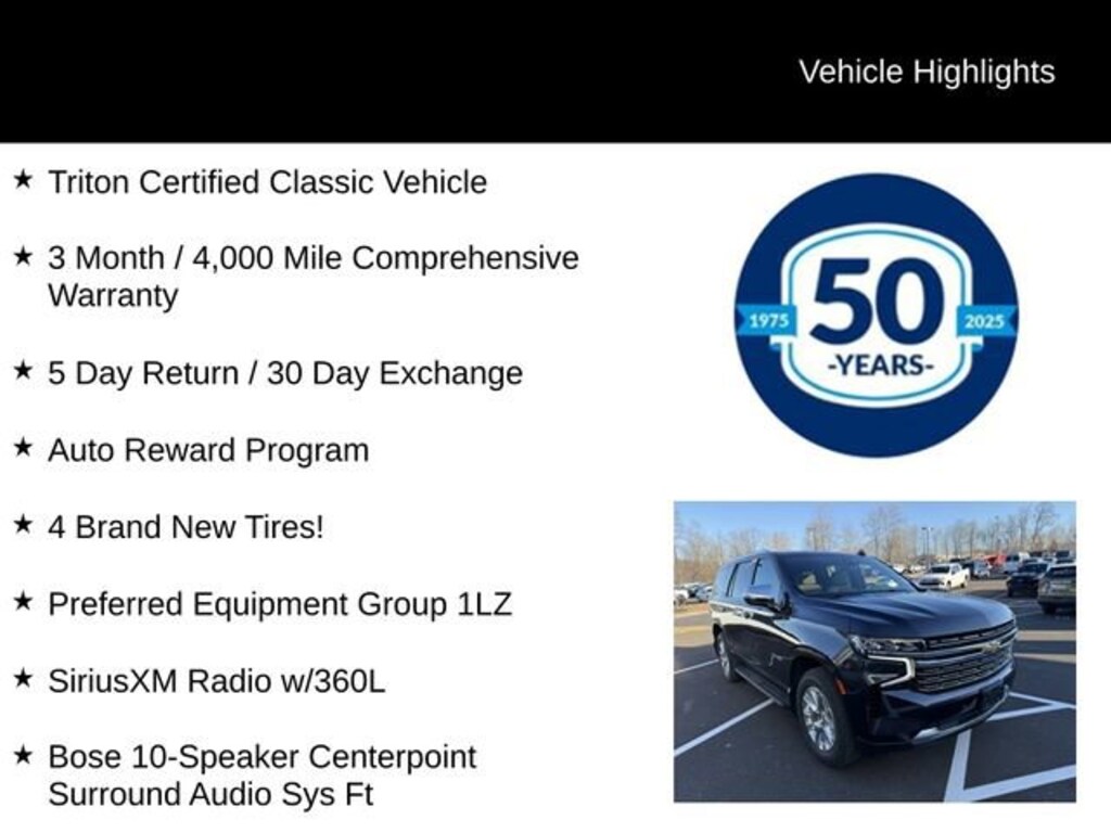 This Triton Certified Classic Vehicle comes with a 3 Month / 4,000 Mile Comprehensive Warranty, giving you peace of mind and confidence in your purchase. With the 5 Day Return / 30 Day Exchange policy, you can test-drive this Tahoe Premier with the assurance that it's the right fit for you.