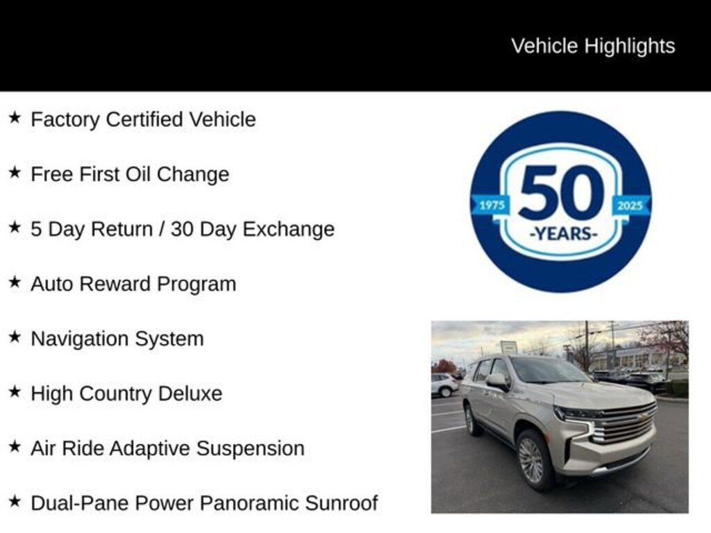 Clean CARFAX. CARFAX One-Owner.Recent Arrival! 2023 Chevrolet Tahoe High Country EcoTec3 6.2L V8 10-Speed Automatic with Overdrive 4WD 4D Sport Utility Empire Beige Metallic Factory Certified Vehicle, Free First Oil Change, 5 Day Return / 30 Day Exchange, Auto Reward Program, 4WD, Jet Black/Mocha Leather, 15 Diagonal Multi-Color Head-Up Display, Air Ride Adaptive Suspension, Apple CarPlay/Android Auto, Dual-Pane Power Panoramic Sunroof, High Country Deluxe, Navigation System, Power-Retractable Assist Steps.Certified. Chevrolet Certified Pre-Owned Details:* Roadside Assistance* Limited Warranty: 12 Month/12,000 Mile (whichever comes first) from certified purchase date* 24 months/24,000 miles (whichever comes first) Certified Pre-Owned Scheduled Maintenance Plan and 3 days/150 miles (whichever comes first) Vehicle Exchange Program. SiriusXM 3-month trial subscription.* Warranty Deductible: $0* 172 Point Inspection* Transferable Warranty* Vehicle History* Powertrain Limited Warranty: 72 Month/100,000 Mile (whichever comes first) from original in-service dateFor better peace of mind all our used vehicles have a 127-point inspection and come with a 5-day return, 30-day exchange (As-Is vehicles are excluded). Our exclusive Auto Rewards Program provides better value with Free First Oil change, Free Pa State Safety inspections, discounts for local merchants and more. Plus, you can earn up to $2000 towards your next vehicle just by servicing with Fred Beans! As Fred Beans always says, our used cars are better because our reputation depends on it.Although every reasonable effort has been made to ensure the accuracy of the information contained on this site, absolute accuracy cannot be guaranteed. This site, and all information and materials appearing on it, are presented to the user as is without warranty of any kind, either express or implied. All vehicles are subject to prior sale. Price does not include applicable tax, title, license, processing and/or documentation fees. Vehicles shown at different locations are not currently in our inventory (Not in Stock) but can be made available to you at our location within a reasonable date from the time of your request, not to exceed one week. Residency restrictions may apply.