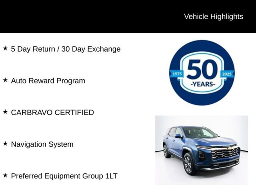 As a Chevrolet Certified Pre-Owned vehicle, this Equinox LT has undergone a rigorous 172-point inspection and comes with a comprehensive warranty package, including a 12-month/12,000-mile Limited Warranty and a 72-month/100,000-mile Powertrain Limited Warranty. Additionally, you'll enjoy 24 months/24,000 miles of Certified Pre-Owned Scheduled Maintenance and a 3-day/150-mile Vehicle Exchange Program, ensuring your complete satisfaction.