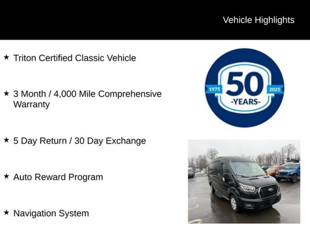 As a Triton Certified Classic Vehicle, this 2023 Ford Transit-350 XLT has undergone a rigorous inspection and reconditioning process, ensuring it meets the highest standards of quality and reliability. With a comprehensive 3-month/4,000-mile warranty, you can drive with the peace of mind that comes from owning a vehicle you can trust.