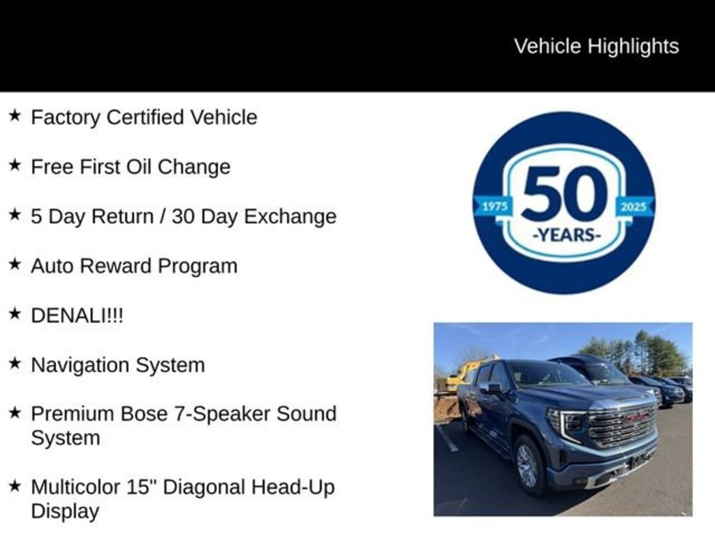 Recent Arrival! 2024 GMC Sierra 1500 Denali EcoTec3 5.3L V8 10-Speed Automatic 4WD 4D Crew Cab Downpour Metallic Factory Certified Vehicle, Free First Oil Change, 5 Day Return / 30 Day Exchange, Auto Reward Program, DENALI!!!, 10-Speed Automatic, 4WD, Jet Black Leather, Multicolor 15 Diagonal Head-Up Display, Navigation System, Premium Bose 7-Speaker Sound System.