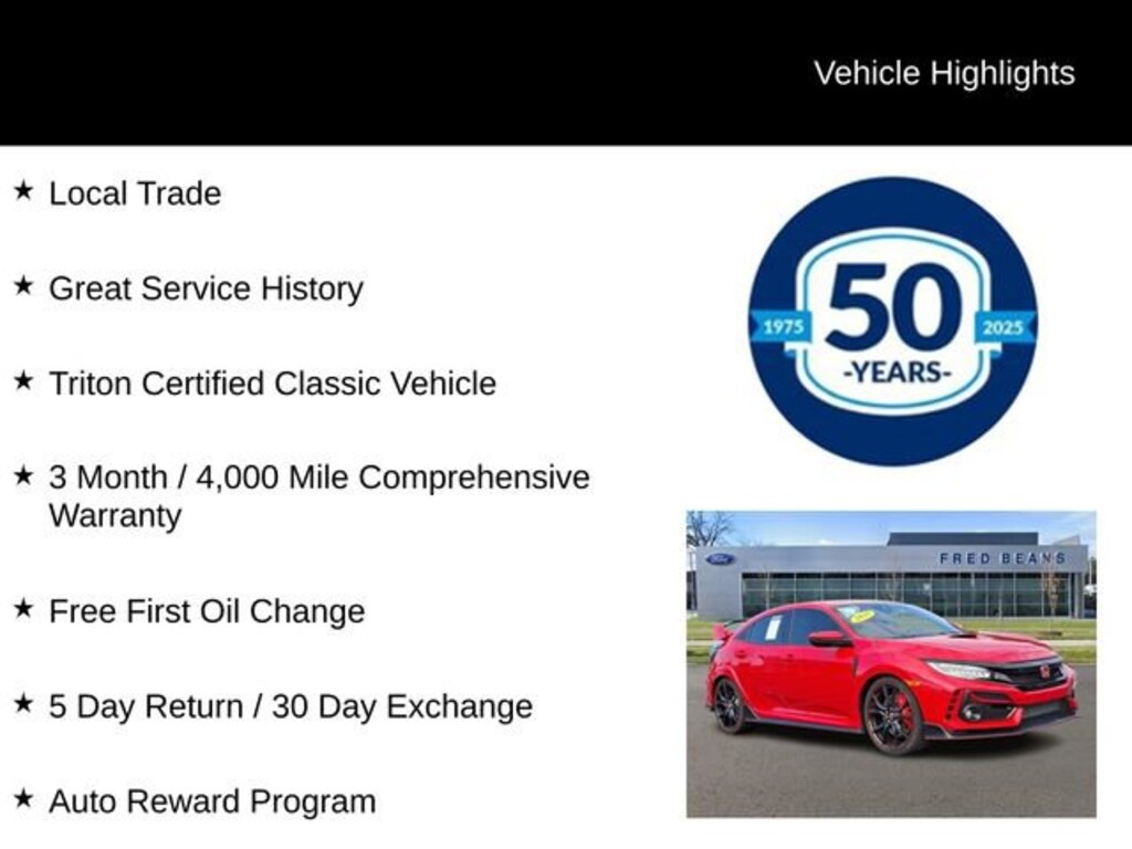 Recent Arrival! 2020 Honda Civic Type R Touring 2.0L I4 DOHC 16V 6-Speed Manual FWD 4D Hatchback Rallye Red Local Trade, Great Service History, Triton Certified Classic Vehicle, 3 Month / 4,000 Mile Comprehensive Warranty, Free First Oil Change, 5 Day Return / 30 Day Exchange, Auto Reward Program, Civic Type R Touring, 4D Hatchback, 2.0L I4 DOHC 16V, 6-Speed Manual, FWD, Rallye Red, Black/Red w/Suede-Effect Fabric Seating Surfaces w/Type R Logo.