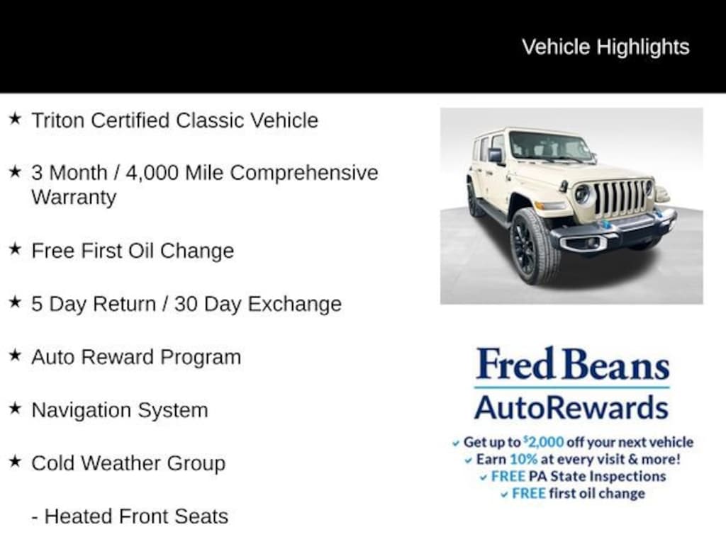Discover the perfect blend of rugged capability and modern comfort with the 2022 Jeep Wrangler Unlimited Sahara 4xe. This exceptional SUV is more than just a head-turning off-road icon - it's a true masterpiece of engineering and design. Triton Certified Classic Vehicle 3 Month / 4,000 Mile Comprehensive Warranty Free First Oil Change 5 Day Return / 30 Day Exchange Auto Reward Program Sky 1-Touch Power Top Cold Weather Group (Heated Steering Wheel, Remote Start System, Heated Front Seats) Limited Edition Gobi Clearcoat ExteriorThe Wrangler Unlimited Sahara 4xe is a testament to Jeep's commitment to innovation. With its 2.0L I4 DOHC engine and 8-speed automatic transmission, this 4WD powerhouse delivers exceptional performance both on and off the beaten path. But the real star of the show is the advanced 4xe hybrid system, which seamlessly blends electric and gas power for a thrilling and efficient driving experience.Slip behind the wheel and you'll be surrounded by a wealth of premium features that elevate the Wrangler Unlimited Sahara 4xe to new heights. Enjoy the convenience of Apple CarPlay and Android Auto, the comfort of heated front seats and a heated steering wheel, and the convenience of a Remote Start System. The Sky 1-Touch Power Top makes it easy to enjoy the great outdoors, while the Removable Rear Quarter Windows and Power Top Quarter Window Storage Bag provide unparalleled versatility.This Wrangler Unlimited Sahara 4xe is a Triton Certified Classic Vehicle, meaning it has undergone a rigorous inspection and reconditioning process to ensure it meets the highest standards of quality and reliability. With a 3 Month / 4,000 Mile Comprehensive Warranty, you can drive with confidence, knowing that your investment is protected.Whether you're embarking on off-road adventures or navigating the daily commute, the 2022 Jeep Wrangler Unlimited Sahara 4xe is the ultimate companion. Experience the perfect blend of capability, comfort, and cutting-edge technology. Visit our showroom today and let us help you discover the Wrangler that's perfect for you.