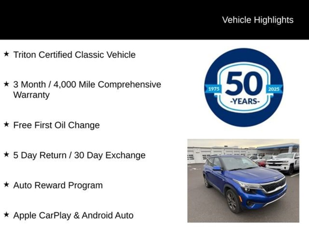 Recent Arrival! 2021 Kia Seltos S 2.0L I4 MPI CVT AWD 4D Sport Utility Neptune Blue Triton Certified Classic Vehicle, 3 Month / 4,000 Mile Comprehensive Warranty, Free First Oil Change, 5 Day Return / 30 Day Exchange, Auto Reward Program, Apple CarPlay & Android Auto.Certified. Certification Program Details: Triton Certified Shield Classic 3-Month or 4,000-Mile Comprehensive Coverage ($100 deductible) 100+ Multipoint Inspection PA State Inspection & Emissions Test Oil, Lube, & Filter Service Completed 5-Day Return Policy1 30-Day Exchange Policy2 CARFAXTM Report AutoRewards Membership See salesperson for additional offers & complete details.For better peace of mind all our used vehicles have a 127-point inspection and come with a 5-day return, 30-day exchange (As-Is vehicles are excluded). Our exclusive Auto Rewards Program provides better value with Free First Oil change, Free Pa State Safety inspections, discounts for local merchants and more. Plus, you can earn up to $2000 towards your next vehicle just by servicing with Fred Beans! As Fred Beans always says, our used cars are better because our reputation depends on it.Although every reasonable effort has been made to ensure the accuracy of the information contained on this site, absolute accuracy cannot be guaranteed. This site, and all information and materials appearing on it, are presented to the user as is without warranty of any kind, either express or implied. All vehicles are subject to prior sale. Price does not include applicable tax, title, license, processing and/or documentation fees. Vehicles shown at different locations are not currently in our inventory (Not in Stock) but can be made available to you at our location within a reasonable date from the time of your request, not to exceed one week. Residency restrictions may apply.