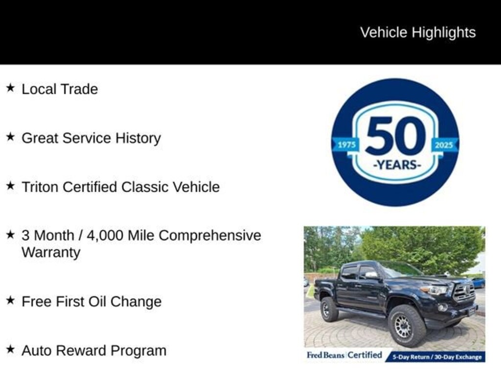 CARFAX One-Owner.Recent Arrival! 2018 Toyota Tacoma Limited V6 3.5L V6 PDI DOHC 24V LEV3-ULEV70 278hp 6-Speed Automatic 4WD 4D Double Cab Midnight Black Metallic 4WD, ABS brakes, Active Cruise Control, Alloy wheels, Compass, Electronic Stability Control, Front dual zone A/C, Illuminated entry, Leather Seat Trim, Low tire pressure warning, Navigation System, Power moonroof, Remote keyless entry, Traction control.Odometer is 39136 miles below market average!Certified. Certification Program Details: Triton Certified Shield Classic 3-Month or 4,000-Mile Comprehensive Coverage ($100 deductible) 100+ Multipoint Inspection PA State Inspection & Emissions Test Oil, Lube, & Filter Service Completed 5-Day Return Policy1 30-Day Exchange Policy2 CARFAXTM Report AutoRewards Membership See salesperson for additional offers & complete details.For better peace of mind all our used vehicles have a 127-point inspection and come with a 5-day return, 30-day exchange (As-Is vehicles are excluded). Our exclusive Auto Rewards Program provides better value with Free First Oil change, Free Pa State Safety inspections, discounts for local merchants and more. Plus, you can earn up to $2000 towards your next vehicle just by servicing with Fred Beans! As Fred Beans always says, our used cars are better because our reputation depends on it.Awards:* 2018 KBB.com Best Resale Value Awards * 2018 KBB.com 5-Year Cost to Own Awards * 2018 KBB.com 10 Most Awarded BrandsAlthough every reasonable effort has been made to ensure the accuracy of the information contained on this site, absolute accuracy cannot be guaranteed. This site, and all information and materials appearing on it, are presented to the user as is without warranty of any kind, either express or implied. All vehicles are subject to prior sale. Price does not include applicable tax, title, license, processing and/or documentation fees. Vehicles shown at different locations are not currently in our inventory (Not in Stock) but can be made available to you at our location within a reasonable date from the time of your request, not to exceed one week. Residency restrictions may apply.